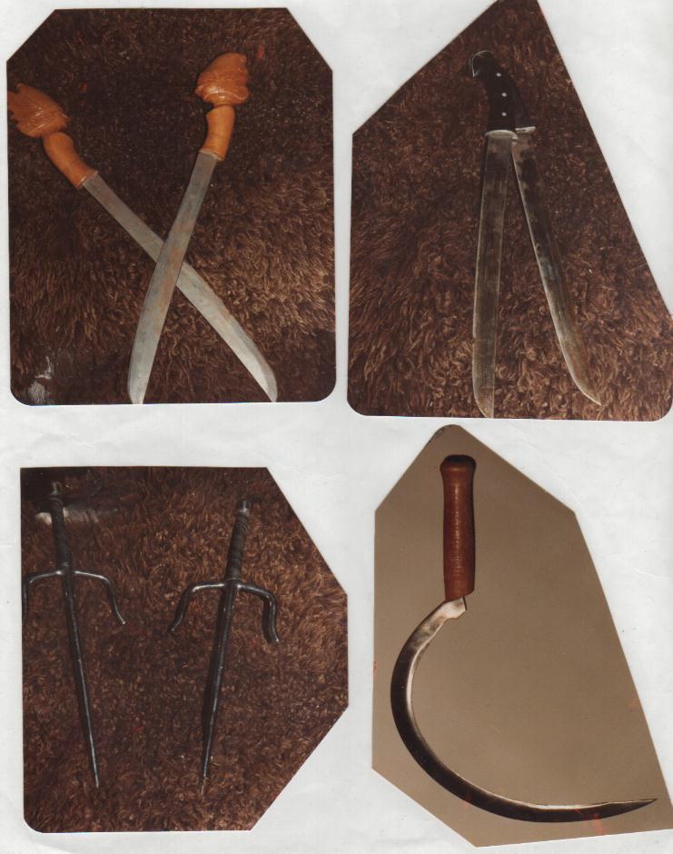 Some weapons used in Silat: Goloks, Tjabang and Arit