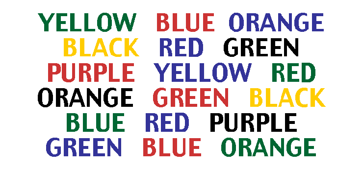 Say the Colors - My favorite! The task is more difficult than it sounds: say aloud the name of the color of the word (not the word itself!). Once you think you can do it pretty well without screwing up, try speeding it up when you say them. It's a left-right conflict; the right side of your brain tries to say the color, but the left side insists on reading the word. 12.0 KB (.gif picture)