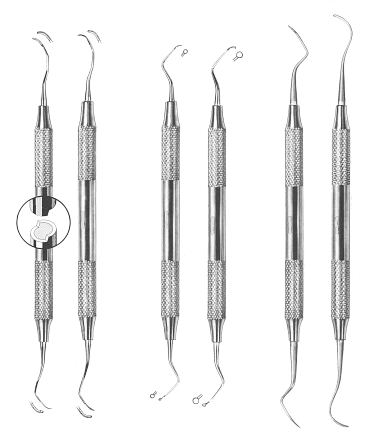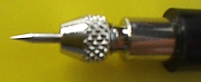 Dalším nepřeberným zdrojem bodových elektrod je zubařské instrumentárium. Modeláři dobře znají stopkové frézy v rozsáhlé škále tvarů od jehlanu přes válec po kouli, to vše s různou drsností povrchu. Frézka jde krásně upnout do krajónu. Šikovný tvar má také háček na odstraňování zubního kamene, různé lancety, špachtle apod. Některé tvary bodových elektrod pro inspiraci ukazují obrázky Hrot_1 a Hrot_2. Zajímavé jsou i Heidemannovy špachtle, excavitátory, škrabky či periodontické nástroje- po rozříznutí a izolaci rukojeti získáme dvojici velmi slušných elektrod z instrumentárního nerezu (pro inspiraci obrázky HS, EXCAV, PERI1, PERI2). Pokud neseženeme nástroj s dutou rukojetí (kupodivu bývají dražší), lze přívodní kablík připájet s tavidlem EMS, do duté rukojeti dobře pasuje panelová zdířka s kovovým závitem. Jako izolace je nejlepší (a nejúhlednější) teplem smrštitelná bužírka vhodné tloušťky, kterou kolmo na osu přeřízneme, navlékneme na rukojeť nástroje a horkým vzduchem z fénu zafixujeme. Intenzitu působení bodové elektrody snadno ovlivníme jejím přitlačením.