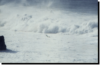 Without a doubt Neil deserves the award for his wipeout, especially since a lesser man may not have survived. As fellow lifeguards and surfers we can all learn from Neil's experience. He survived because he didn't panic and he was mentally and physically prepared for this type of big wave encounter. Neil is not only a regular in the Maverick's line-up, but he also swims regularly (3500 meters several times a week), including breath holding exercises. He can swim 125 yards underwater and can hold his breath for over two minutes. Neil has also paid his dues in meaty Ocean Beach (San Francisco) conditions where it sometimes takes an hour just to paddle out and long swims through massive rip currents are commonplace. Neil figures that all his time in the ocean (he's been surfing for 19 years), his training and his Lifeguard experience really paid off by giving him the confidence to keep his cool during the heaviest wipeout of his life. "If you're comfortable in the ocean and you know what it's going to do then there's no reason to panic," Neil reminds us, "But it's not all fun and games - the ocean can really hurt you."