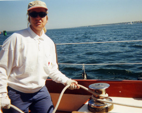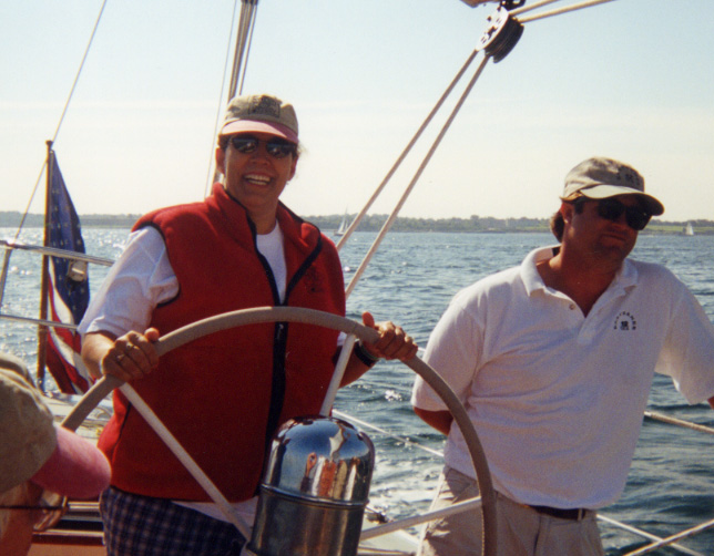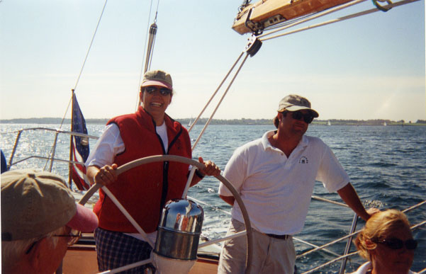 Debi at the wheel of Easterner while our skipper, Eric, takes a short break.