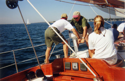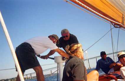 That's Roy sitting behind the starboard coffee grinder. Roy stayed on that grinder all day. We found out later that he probably would have liked to have been relieved by the afternoon. I guess no one offered to take over for him because everyone thought he was doing a such a good job on it.