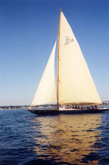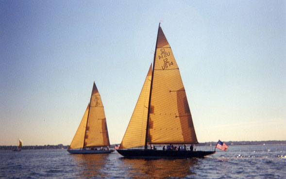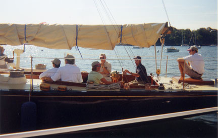 The three wooden twelves rafted up for a box lunch at noon. Gary decided to move the afternoon races out to "his pond" off shore. Normally the chartered twelves stay in the bay, but who's going to refuse Gary. The afternoon race consisted of one windward leg to Courageous's tender and then a long down wind leg back into the Bay near Fort Adams. COURAGEOUS is always escorted by a tender boat because she is not outfitted with a motor. The wind was brutally light, especially for the downwind leg. The twelves are really designed to fly a chute down wind but they won't fly them with charter guests on board. GLEAM walked away with the afternoons race. COURAGEOUS was ahead of us but got bored half way back and ended up turning back to windward then throwing up her spinnaker just to show us how the twelves should be sailed. Gary in NORTHERN LIGHT brought up the rear again. It just wasn't his day. Gary said later that this was his worst twelve meter showing ever.