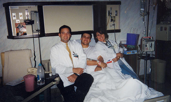Chris in "His Room" at the Rhode Island hospital the first time around, with two of our favorite staff members Drs Jay and Vannessa. They were our constant link to the his primary hematologist and the other doctors and kept us informed in laymans terms of what was going on day to day. They also became our good friends. I say "His Room" because it was room 320. Chris's birthaday is 3-20 and we basically lived there for 3 months the first time around. The second time around he just mentioned that he'd rather be in his old room and before you knew it the Jane Brown 3-North Staff had him moved over there. Not an easy task if you saw all the stuff we had brought in with us, VCRs, Playstations ect.