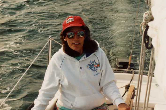 DEBI at the helm of "Lucky-Lady" (Ignore the wake you see from the outboard)
