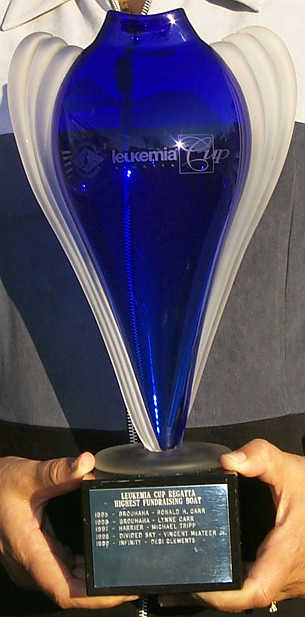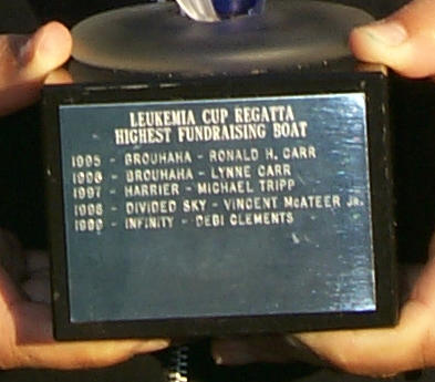hoping the other one would reveal their total. However, after talking with him we were pretty sure that he had first place wrapped up. Also there were rumors about how great some of the other boats had done this year. We were a little upset by this at first then came to our senses and realized that if several boats did beat our total then that meant that several other boats had raised over $12,00 and that would have been great! I have to admit though, that when they called out Scott's name as 2d place and we realized that we had won the Cup again, I was ecstatic and couldn't hold back the tears, especially when Debi held up the Cup and said that "This is for you Bob". Bob Placco was a great