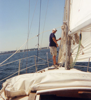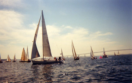 The second race was a shorter 3 mile race. Just before the start the wind actually picked up enough for INFINITY to start moving. We actually got a pretty good start this time. We tacked over toward the Jamestown shore along with Mistress and Tarimasu while the rest of the fleet favored the Newport side. Tarimasu just seemed to disappear once we got close to the Newport Bridge.