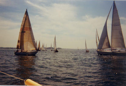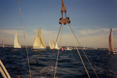 Finally the wind picked up enough for a start. I thought I had a good approach for what I thought was our start, when Deb pointed out a boat near us that was in the class before us. I beared off thinking I must have screwed the sequence up again. But then saw the boats in our class go for the line. Damn, blew it again. It didn't really matter that we got a bad start. INFINITY with her older heavy hull, dirty bottom, and almost transparent headsail, doesn't like light air. We got killed on the first 6 mile race.
