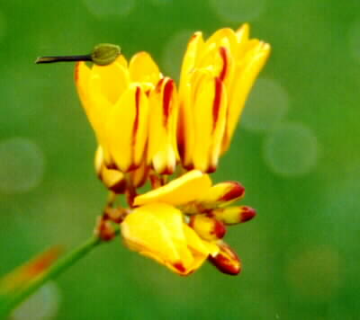 Ixia aurea is known only from the granitic slopes above the Darling-Yzerfontein road, the yellow-orange spikes making a brilliant display when the plants flower in September, occasionally into early October