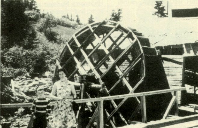 "Smith's water-driven sawmill which operated in Aspey Brook until the 1940's. Vincent Smith poses with a visitor on the bridge leading to the mill."