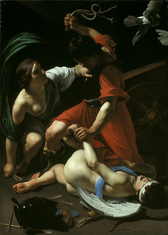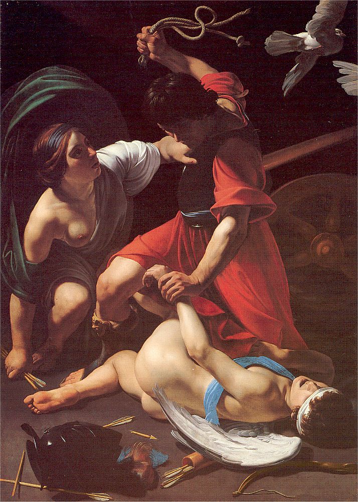 http://www.artic.edu/aic/collections/eurptg/17mac_manfredi.htmlBartolomeo Manfredi chose not to interpret the stories of the Bible and classical mythology as idealized subjects enacted by heroic protagonists but rather as events that happened, or could have happened, to ordinary people. In Cupid Chastised,Mars, the god of war, beats Cupid for having caused his affair with Venus, which exposed him to the derision of the other gods. Using dramatic light effects and depicting the action as close to the viewer as possible, Manfredi conveyed with great immediacy and power this tale of domestic discord, which also symbolizes the eternal conflict between love and war.