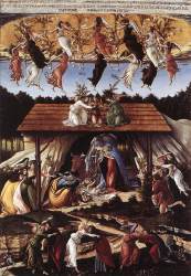 It has been suggested that this picture, the only surviving work signed by Botticelli, was painted for his own private devotions, or for someone close to him. It is certainly unconventional, and does not simply represent the traditional events of the birth of Jesus and the adoration of the shepherds and the Magi or Wise Men. Rather it is a vision of these events inspired by the prophecies in the Revelation of Saint John. Botticelli has underlined the non-realism of the picture by including Latin and Greek texts, and by adopting the conventions of medieval art, such as discrepancies in scale, for symbolic ends. The Virgin Mary, adoring a gigantic infant Jesus, is so large that were she to stand she could not fit under the thatch roof of the stable. They are, of course, the holiest and the most important persons in the painting.The angels carry olive branches, which two of them have presented to the men they embrace in the foreground. These men, as well as the presumed shepherds in their short hooded garments on the right and the long-gowned Magi on the left, are all crowned with olive, an emblem of peace. The scrolls wound about the branches in the foreground, combined with some of those held by the angels dancing in the sky, read: 'Glory to God in the highest, and on earth peace, goodwill toward men' (Luke 2:14). As angels and men move ever closer, from right to left, to embrace, little devils scatter into holes in the ground. The scrolls held by the angels pointing to the crib once read: `Behold the Lamb of God, which taketh away the sin of the world' the words of John the Baptist presenting Christ (John 1:29). Above the stable roof the sky has opened to reveal the golden light of paradise. Golden crowns hang down from the dancing angels' olive branches. Most of their scrolls celebrate Mary: 'Mother of God', 'Bride of God', 'Sole Queen of the World'.