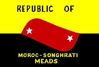 This is how Mr Schneider described the design of the flag; Taking into account the above quote and the fact Morac is spelt incorrectly on the flag, it is safe to assume that Mr Schneider was under the influence of what historians sometimes refer to as "alcohol". Whatever the state of Mr Schneider's mind, the flag was adopted as the national symbol of the newly formed Republic of Morac-Songhrati-Meads in 1964. Article II of the constitution of the republic states "... The National emblem is a flag half yellow and half black with two figures in the center in red juxtaposed with a white star in the center of each figure." This flag was the official national flag until 1968 when it was replaced by our current flag, which you can see on our National Flag Page