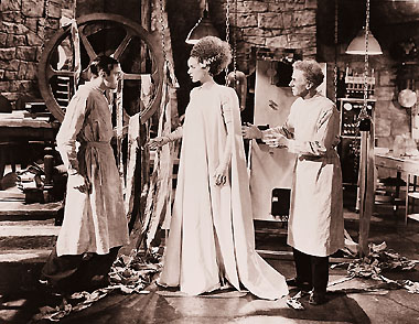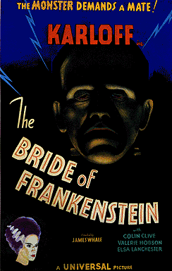 But, she does not seem to go for Frankenstein at all (I think that's sad) even though he approaches her like a friend. So, The Monster has everyone leave but him and his bride and pulls the lever that destroys the tower. As he pulls it, she hisses, and a tear rolls down his face. ): They, as The Monster put it, belong with the dead. And, it ends happy, supposedly.I wish they had fallen in love and had a wedding. Probably sounds twisted. (: But it would have been interesting. Oh well, I didn't write the script, and it would probably have been bad. Check the link below for a GREAT movie line with all the posters and script parts as well. The Classic Monsters Webring, which is top!And the Monster Maniacs zine which I just found and is ESSENTIAL to classic horror movie fans! Happy Halloween! SHE LIVES! hehehehehehehe. (;