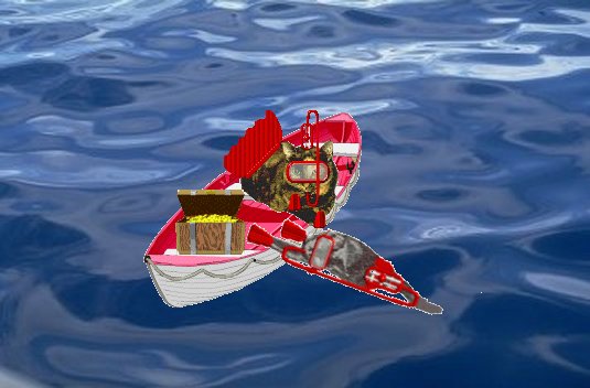Mysty sez: "Look what we found under da water!" Queen Bitsy sez: "Oh, my goodness! Mew found a treasure! I must rememfur to write dis in my column!" Moke sez: "Yes, we're rich kitties now!" Queen Bitsy sez: "Maybe so, but no kitties are richer den I am."