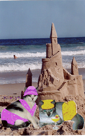 Meanwhile...... Snowey and Misty have build themselves a sandcastle........ Misty sez: "Oh, Snowey, mew build da best sandcastles in da world!" Snowey sez: "Mew say da sweetest fings! Purrrrrrrrr."