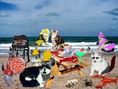 Meanwhile, at Patches' picnic table....... Queen Bitsy sez: "Haf mew got anyfing more to eat?" Patches sez: "I've got some steaks cooking on da barbeque grill now, if mew can wait." Summer Sunshine sez: "Haf a seat and help mewrself, mewr highness." Misty sez: "Hope mew got some left for me!" Snowey sez: "Don't worry, Misty, I'll save mew some!"