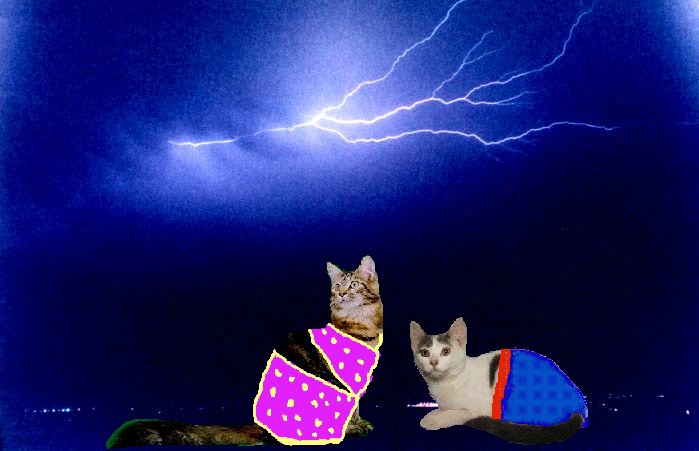 Summer Sunshine sez: "Meow! Patches! LOOK!!!!!" Patches sez: "Uh, oh! Lightning! Guess we'd better go home now!"