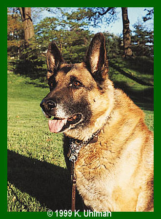 Ian's picture is a semi-finalist in the photography contest at The International Library of Photography (taken by yours truly)! It is being published in a book called The Looking Glass. This is my copyrighted photo. Copyright 1999 by KU. Please do not copy this picture without asking me first! Thanks! Comments welcome. Email me with your comments and suggestions. Ian was my purebred german shepherd male. He passed on to the rainbow bridge in 1990. He was 15 years old. Use the form below to email me.