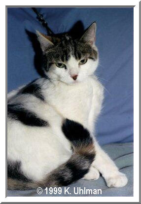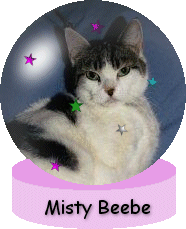 Grrrrreetings! I'm Misty, the new writer-cat on the block. I just thought I'd stroll on in here and introduce myself to you. I'm a calico tabby female with patches of black and orange on a mostly white body. I have my tabby stripes, of course, as any self-respecting tabby would be proud to have, and double paws (that's polydactyl to those of you who don't understand what double paws are, extra toes). I also have a partially black and partially pink nose. Some folks say mother nature forgot to finish painting my nose when she created me! LOL! Well, that's just what it looks like she did! I spend my lazy afternoons lounging around on my mistress' bed. Yes, I call her my mistress, but really, I own her, she doesn't own me! Ahem... I'm what you'd call a pampurred cat. I like to climb trees, chase birds and bugs, play with catnip toys, and pose for pictures. I'm very proud of my show biz career on my mistress' homesite at the Pet Vine. I'm an avatar! And proud of it, too! I even meow on tapes for my mistress. She thinks I don't know what that is. But I love to "talk" for her. I do that quite alot. I'm very vocal. It has been said that I'm too smart for my own good because I can open doors. Well, it's my pleasure and priviledge to be smart! Cats are smarter than people anyway! Meow! I used to swing on the bars of my cage, when I was little, and spring the door open so I could get out and investigate my home. But I don't live in the cage any more. I haven't for a long time. That was just a place I needed to be till I learned and grew, so I wouldn't get hurt on things in the house, like electrical wires. Now I have the run of the house where I live with my mother, my half brother, an unrelated friend cat, and two dogs. Hope to see you around! Purring, Misty Beebe