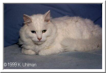 Grrrreetings! My name is SnowPuff. I'm a cat who is a super pampered pet in that I have survived against incredible odds. I have kidney disease. A year ago this past May, my mistress found out from our vet that I was dying from kidney disease. The vet recommended having me put humanely to sleep. However, he also said he could try treating me, but didn't hold out much hope for my survival. So my mistress decided to give me a chance to live and opted to have the vet treat me. After a week in the animal hospital in intensive care, in which I received fluids and medication and many tests, I was sent home. My mistress began a program of forcefeeding me on a special diet Hill's Science Diet puts out called Feline K/D. She also gave me my medicine in pill form and gave me fluids provided by our vet. After a few months on this treatment, I gained my weight back and got over being dehydrated. In fact, I have recovered so well, I even like to run, jump, and play! I run marathons across my mistress' bed every morning to wake her up, by jumping back and forth over her sleeping body till she gets up!!! The vet called me a miracle cat and I am just that. I was expected to die. They didn't give me more than a month to live. But I fooled them! I have lived for more than a year since my brush with death. Although I will always have kidney disease and must be constantly tended to with special diet and medications, I am a vibrant, healthy, happy cat today. To my mistress, I will always be her super pampered pet, the cat that defied death and won! It just goes to show you, you can't keep a good cat down! Your Friend, SnowPuff