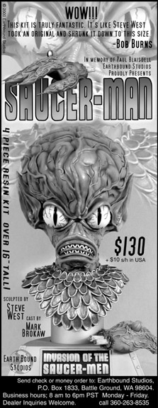 The Saucer Man New from Earth Bound Studios comes "The Saucer Man ". Sculpted by Steve West and Molded and cast by Mark Brokaw. This 4 piece,16 inch tall bust, is the first in a line of kits by Earth Bound called the Big Heads. This kit retails for $130.00 plus $10.00 shipping. To order contact Mark Brokaw at: Earth Bound Studios P.O. Box 1833, Battle Ground, WA, 95604 Phone:(360)263-8535 Hours: 8am-5pm PST Email: earthboundstudios@yahoo.com