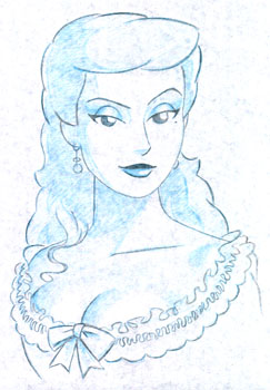 | Another sketch from "The Scarlet Pimpernel," this one inspired by Rachel York's Marguerite St. Just. Efforts were made to differentiate this design from my "Christine Daae" design. As Marguerite has more of a femme fatale edge to her, I made the facial features more angular, her eyes larger and more prominent, lips fuller, etc. And, of course, our innocent little Christine would never dress like this! |