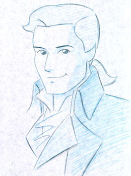 | My second favorite musical, "The Scarlet Pimpernel," inspired this sketch of Sir Percival Blakeney. This character is a challenge in design terms as the correct balance must be struck between the heroic and the effeminate as Percy is a hero who masquerades as a fop. I don't think I've found that balance yet, so this sketch stands as a preliminary design. |