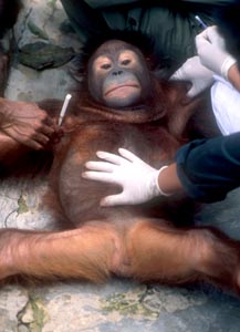 Monthly Threatment At least 180 orang utan (Pongo Pygmaeus) have been living in the center of Rehabilitation of Orang Utan in Wana Riset, Samboja, East Kalimantan. Before they are released to the wild jungle, orang utans have a medical check and threatment montly. The Orang Utans also have exercises how to life in wild jungle, such as finding a fruit and livng together among them. Most of orang Utans taken from people who live around the jungle and take an orang utan as a pet. (zarqoni maksum - Oktober 2002) |