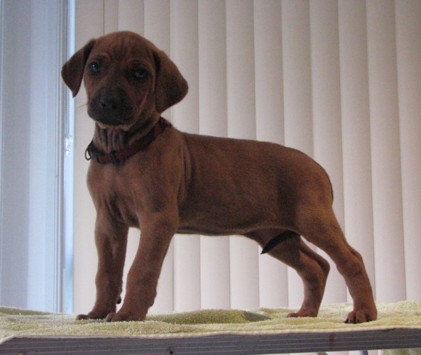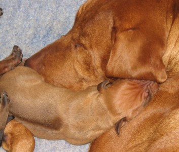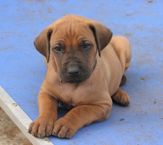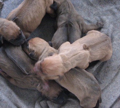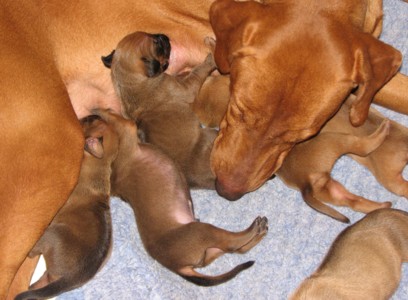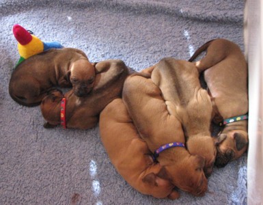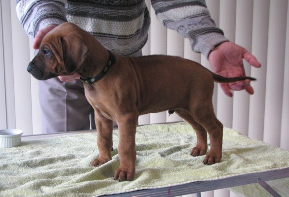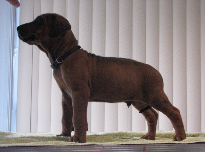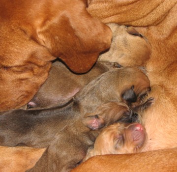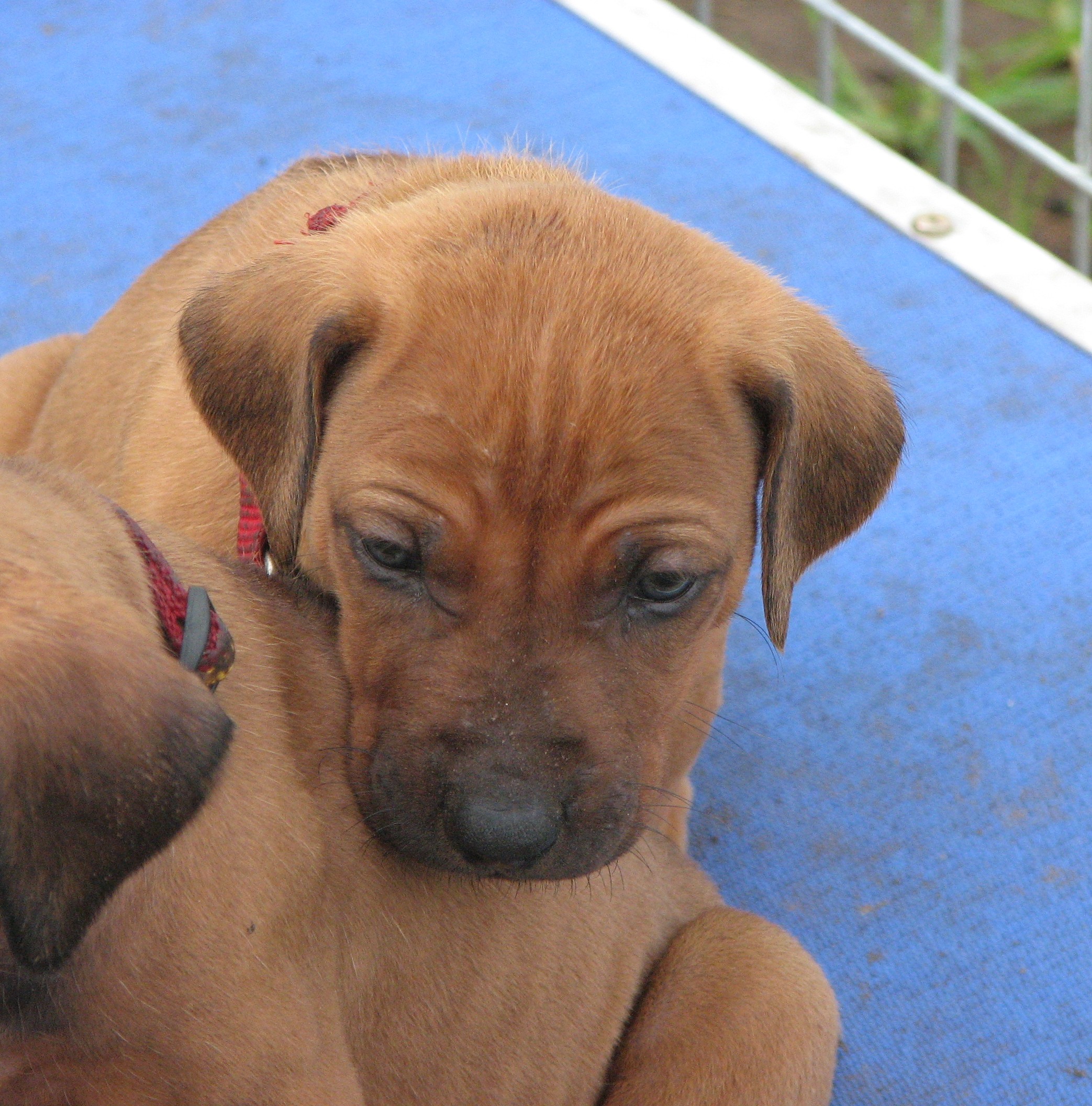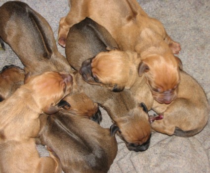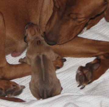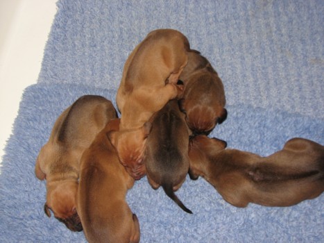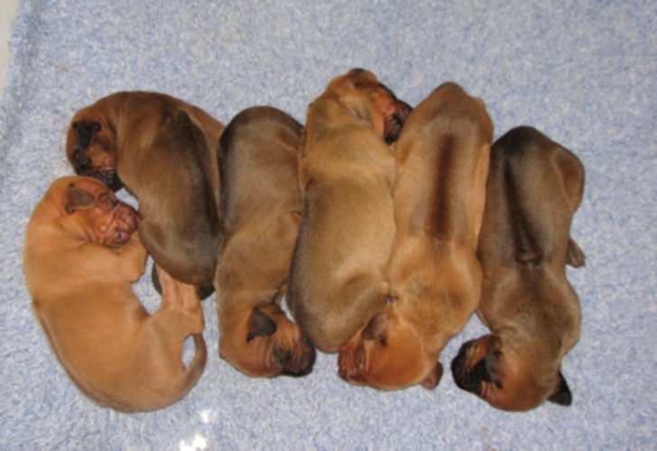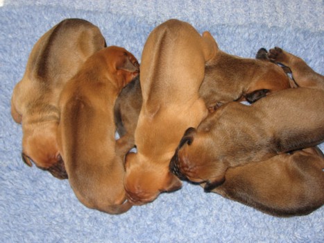 6 beautiful healthy puppies have arrived. 2 girls, 4 boys, 2 of them livers. At this stage they seem to be all show potential, with some excellent ridges, Nice healthy puppies and Amanzi is doing well. She is calm,