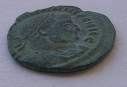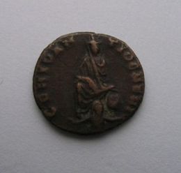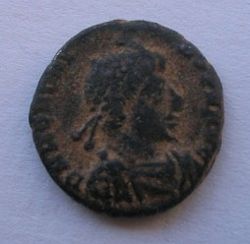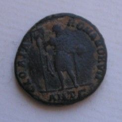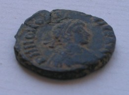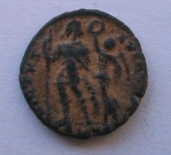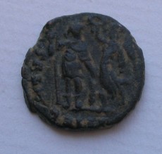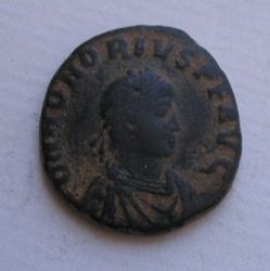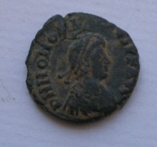 Honorius AE4(16mm) 2.5g 395-423 AD. Obverse: DN HONORI-VS PF AVG pearl diademed draped and cuirassed bust right. Reverse: VIRTVS-EXERCITI (missing mostly) emperor standing left head right holding spear and resting left hand on shield. Victory standing beside him crowns him with a wreath that she