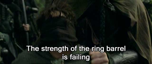 Galadriel: The strength of the Ringbearer is failing. Hooray, the Sharuman is attacking himself!