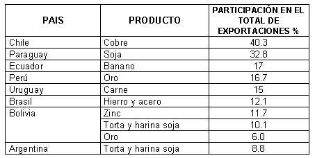 Tabla 1. Principales productos exportados de países seleccionados del Cono Sur. Se observa que los recursos naturales representan un alto porcentaje en las ventas exteriores; para el caso de Bolivia se indican los tres primeros productos. Basado en CEPAL para datos de 2000.