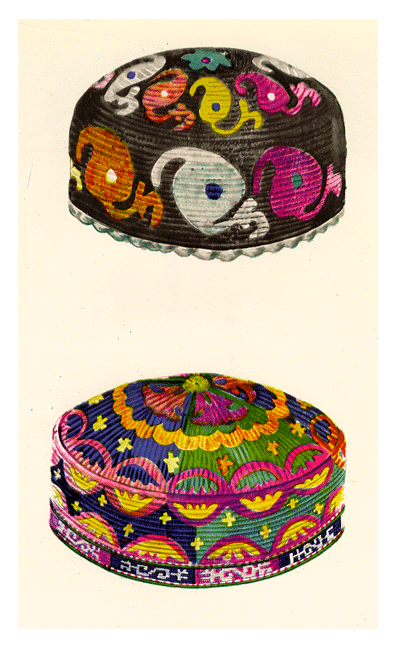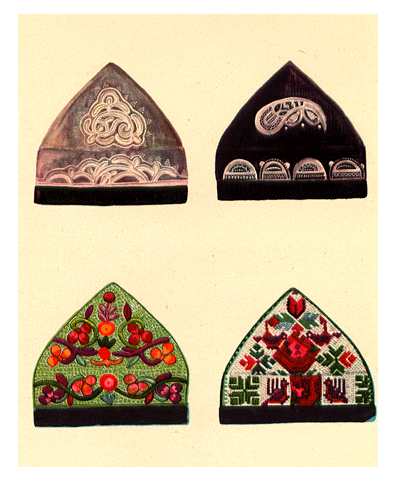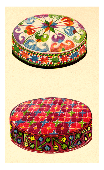 Embroidered skull caps (tyubeteikas) have always been popular among the Tajiks. During the Soviet years, they became even more popular and were manufactured by numerous artels as well as by individual needleworkers. The tyubeteikas for brides and bridegrooms are especially beautiful. Many Tajiks continue to wear their traditional tyubeteikas with the rest of their western-style wardrobe.