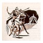 When they heard the clatter of the horses' hooves, they woke with a start and turned to face the approaching riders, not taking their eyes off them until they galloped up to the fire.