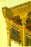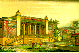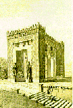 Pictorial Reconstruction This pictorial reconstruction restores, to a degree, not only the skeletal frame but the woodwork and the color that dazzled Darius's visitors. Of special interest are the guarding lions on the two sides of the roof, the parapets, the central position of the winged being, and the stylized frieze in which a lion disables a bull, a reminder of the power of Good over Evil.