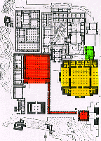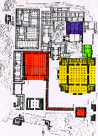 This last blue print shows the rest of the buildings of the complex. The most important of these is the Treasury Building to the left of the Hall of 100 Columns (indicated in red and yellow). In the center of the complex (in Deep Red) is the Tripylon, which served as a cross-roads of sorts. From the Tripylon you could go to either of the apadanas or the palaces. The last addition is Xerxes's Harem Quarters, attached to his palace (in yellow).