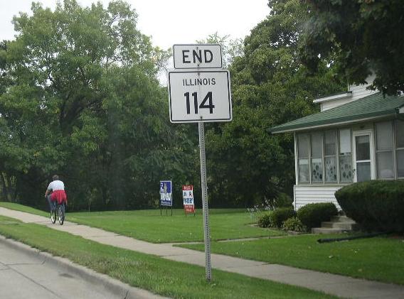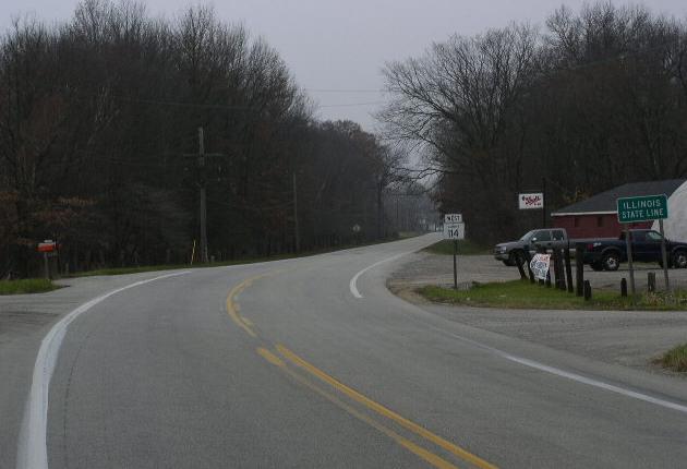 Guide markers on NB IL St Rt 1/EB IL St Rt 17. A guide marker on SB IL St Rt 1/WB IL St Rt 17. WB IL St Rt 114 at the Indiana/Illinois State Line. Illinois State Line Sign on WB IL St Rt 114 at the Illinois/Indiana State Line. WB IL St Rt 114 at the Illinois Welcome Sign. WB IL St Rt 114 at the Illinois Welcome Sign. (March, 2008) EB IL St Rt 114 in Rural Kankakee County A mileage sign on EB IL St Rt 114. EB IL St Rt 114 east of Momence. EB IL St Rt 114 in Momence. Junction marker on NB IL St Rt 1/EB IL St Rt 17. The western end in Momence. The western end marker.