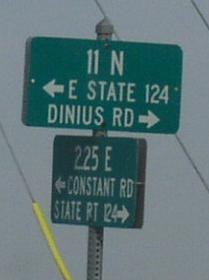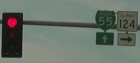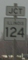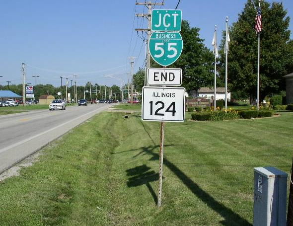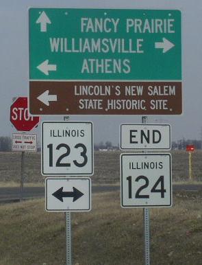 A junction marker on WB IL St Rt 123. NB IL St Rt 124 at the new end point at IL St Rt 123. The new northern end marker. A street sign in Rural Sangamon County. Sangamon County mileage sign. A junction sign on SB BUSN. Loop I-55 at Sherman. The southern end in Sherman. Southern end marker.