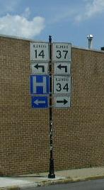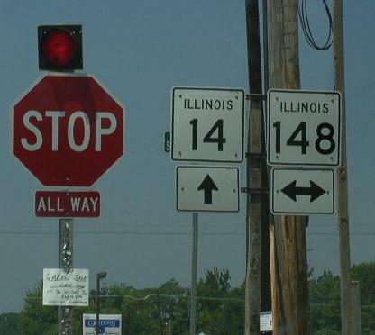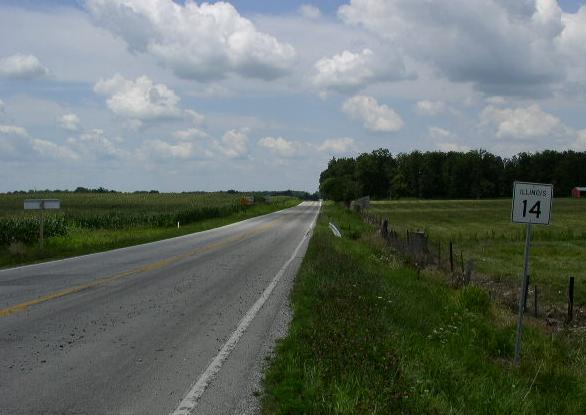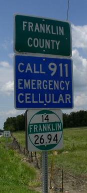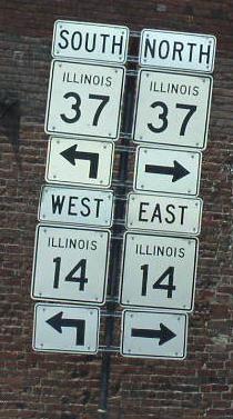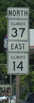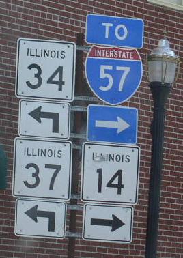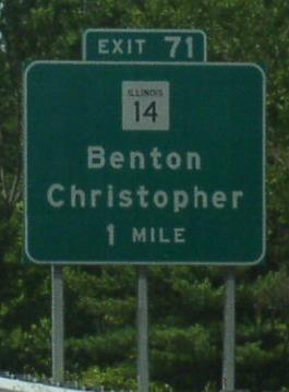 A Franklin County mile marker. WB IL St Rt 14 at the Franklin/Hamilton County Line. WB IL st Rt 14 east of Benton. WB IL St Rt 14/SB IL St Rt 37 in Benton. A set of guide markers on the square in Benton. A BGS on NB I-57. WB IL St Rt 14 in Christopher. WB IL St Rt 14 near the Franklin/Perry County Line.