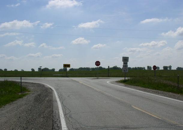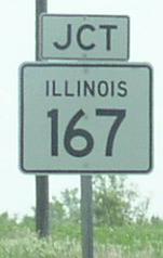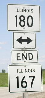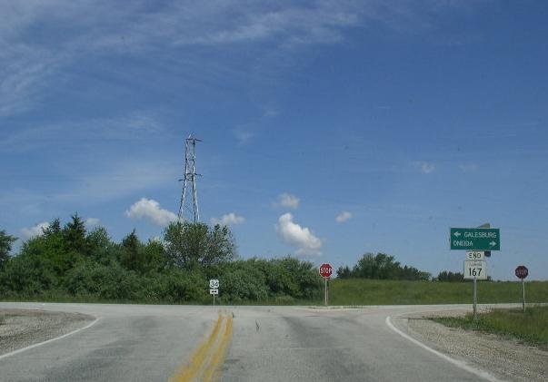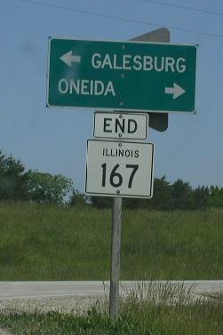 A junction sign on SB IL St Rt 180. The eastern end of IL St Rt 167. The eastern end marker. A Knox County mile marker. WB IL St Rt 167 near Victoria. WB IL St Rt 167 near Oneida. WB IL St Rt 167 near Watega. The western end of IL St Rt 167. The western end marker.