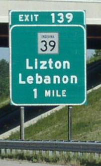 Indiana State Route 39 is a north-south highway in Boone County. IN St Rt 39 passes through the following towns in Boone County. New Brunswick Milledgeville Lebanon Stringtown Pike IN St Rt 39 is not multi-plexed in Boone County. IN St Rt 39 intersects the following highways in Boone County. Interstate 65, at Lebanon. U.S. Rt. 52, at Lebanon. Indiana State Route 32, at Lebanon.