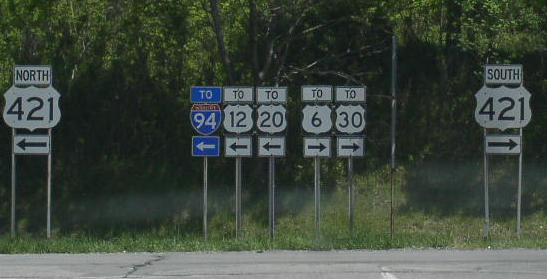 A set of guild markers on the ramp from WB I-80/90/IN E-W Toll Rd. to U.S. Rt. 421. WB U.S. Rt. 30, west of U.S. Rt. 421.