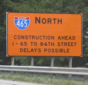 A warning sign on NB I-465 for a work zone on the northwest side of Indianapolis. (Aug., 2004)
