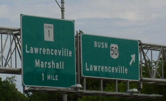 The western end of BUSN U.S. Rt. 50. The western end marker. A BGS on EB U.S. Rt. 50. A junction sign on EB IL St Rt 250 at Lawrenceville. EB BUSN. U.S. Rt. 50 in Lawrenceville. EB BUSN. U.S. Rt. 50 near Downtown Lawrenceville. A Lawrence County mile marker on the eastside of Lawrenceville. Note: For the BUSN. designation the use of the letter "B". In Woodford and Tazewell Counties on BUSN. U.S. Rt. 24, "BUSN" was used instead of a "B". A BGS on WB U.S. Rt. 50. Another BGS on WB U.S. Rt. 50. The eastern end of BUSN U.S. Rt. 50. The eastern end marker.