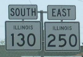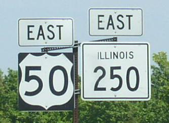 EB U.S. Rt. 50/IL St Rt 250 on the southside of Olney. SB IL St Rt 130/EB IL St Rt 250 in Olney. EB IL St Rt 250 west of Olney. A Richland County mile marker. A junction marker on EB U.S. Rt. 50. The western end of IL St Rt 250. The western end marker.