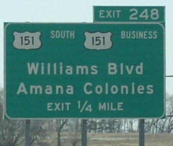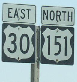 Spur of U.S. Rt. 151 in Linn County. A BGS on WB U.S. Rt. 30/SB U.S. Rt. 151/NB U.S. Rt. 218. NB U.S. Rt. 151/EB U.S. Rt. 30 near I-380/IA 27 at Cedar Rapids. BGS on NB I-380/U.S. Rt. 218/IA 27. NB U.S. Rt. 151/EB U.S. Rt. 30 on the Lincoln Freeway. BGS on NB U.S. Rt. 151/EB U.S. Rt. 30 near IA 13. NB U.S. Rt. 151/EB U.S. Rt. 30 near IA 13. Heading north on U.S. Rt. 151/IA 13 near Bertram.