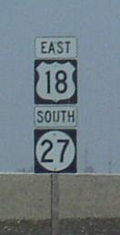 Branches of U.S. Rt. 18 in Cerro Gordo County. A BGS on SB I-35/IA St Rt 27. SB BUSN Loop I-35/WB U.S. Rt. 18, west of I-35. A junction marker on WB BUSN U.S. Rt. 18/IA St Rt 122. A BGS on SB I-35; EB U.S. Rt. 18; SB IA St Rt 27. SB I-35; EB U.S. Rt. 18; SB IA St Rt 27 near Mason City. EB U.S. Rt. 18/SB IA St Rt 27 at the interchange with I-35. This is a incomplete interchange. It is set for a westward extention of the expressway. EB U.S. Rt. 18/SB IA St Rt 27 on the future colector/distributor lanes for the interchange with I-35. EB U.S. Rt. 18/SB IA St Rt 27 south of Mason City. EB U.S. Rt. 18/SB IA St Rt 27 southeast of Mason City.