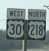 A BGS on EB U.S. Rt. 30/NB U.S. Rt. 151/SB U.S. Rt. 218. NB I-380/U.S. Rt. 218/IA. 27 near U.S. Rt. 30/151 in Cedar Rapids. SB I-380/IA. 27 near the same interchange. Looking east along EB U.S. Rt. 30/SB U.S. Rt. 218 at the Linn/Benton County Line.