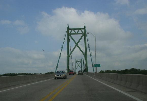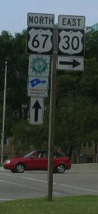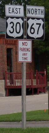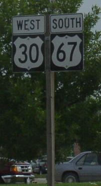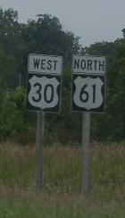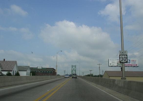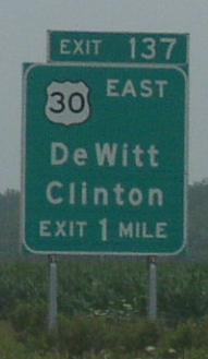 WB U.S. Rt. 30/NB U.S. Rt. 61 near De Witt. A BGS on WB U.S. Rt. 30/NB U.S. Rt. 61. A BGS on NB U.S. Rt. 61. A set of guide markers in Clinton. WB U.S. Rt. 30/NB U.S. Rt. 67 on the westside of Clinton. EB U.S. Rt. 30/NB U.S. Rt. 67 in Clinton. EB U.S. Rt. 30 at the Iowa side of the Mississippi River Bridge. EB U.S. Rt. 30 crossing the Mississippi River. EB U.S. Rt. 30 in mid-span of the Mississippi River Bridge.